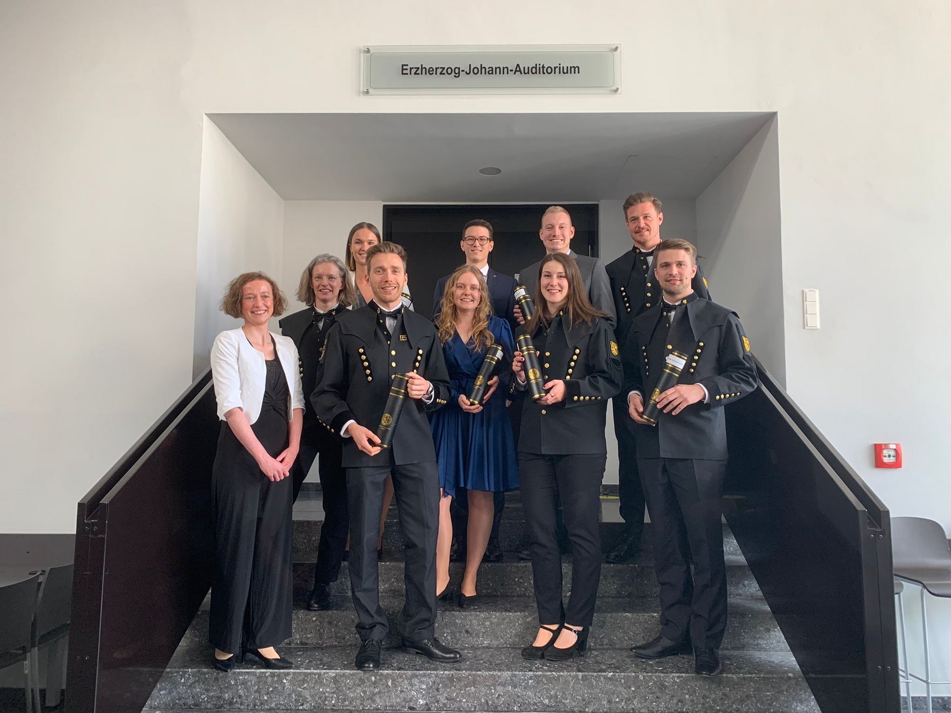 Die glücklichen Absolventen*innen und Prüferinnen: oberste Reihe v.l.n.r.: Veronika Koss, Philip Wehinger, Franz Puregger, Sebastian Schmid (Absolventen*innen) mittlere Reihe v.l.n.r.: Clara Schuecker (Prüferin), Valentina Wögerbauer (Absolventin) unterste Reihe v.l.n.r.: Katharina Resch-Fauster (Prüferin), Markus Schwaiger, Carina Maurer, Alexander Ladinig (Absolventen)