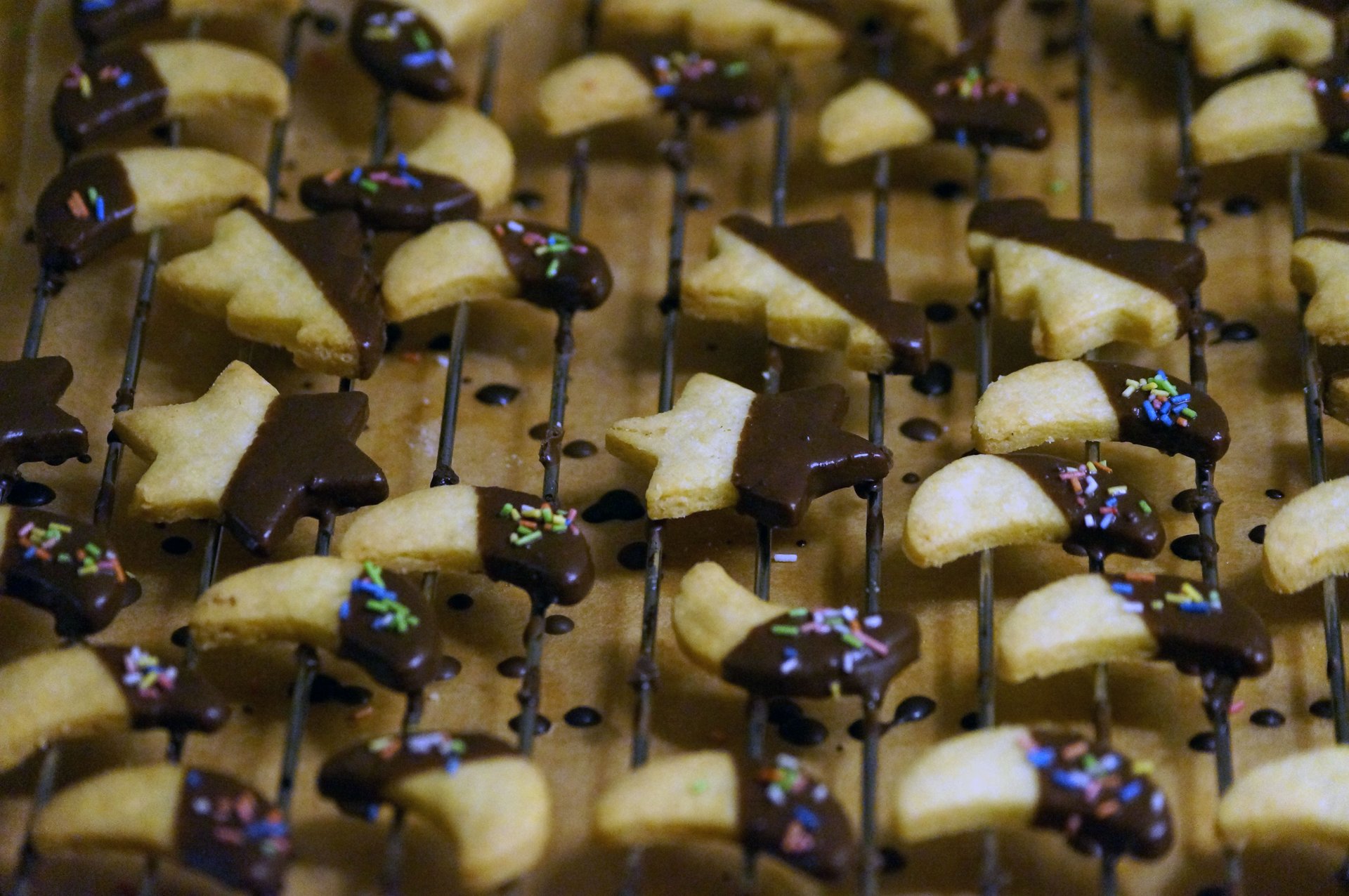 Die Füllung für die Pariser Hütchen wird jetzt zusammengerührt und auf die ausgekühlten Kekse gespritzt. Anschließend folgt die Arbeit meiner Schwester: das Tunken der Vanillekekse und der Pariser Hütchen in Schokoglasur. Während sie die Kekse tunkt, verwerten wir gemeinsam die restliche Füllung der Pariser Hütchen, Keksreste, zerbrochene Kekse und Rum (viel davon. Je mehr, desto besser). Mit ein bisschen Kochschokolade (oder viel) und Kakaopulver wird daraus die Masse für die Rumkugeln. Aus dieser werden Kügelchen geformt und auf kleine Papierförmchen gesetzt. Die Vanillekipferl müssen noch heiß im Zucker gewendet werden, damit er auf ihnen hält. Fertig!