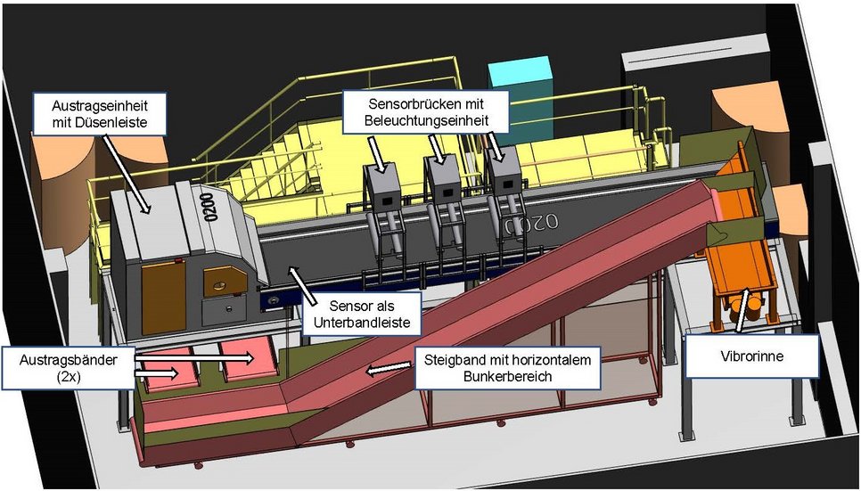 Die Anlage ist für die Behandlung nicht gefährlicher Abfälle in einem Korngrößenbereich von 30-300 mm ausgelegt. Die gesamte Fördertechnik ist in der Geschwindigkeit individuell einstellbar. Ein Steigband dient zum Materialtransport auf die Vibrorinne und kann aufgrund der Montage auf Rollen positionsflexibel eingesetzt werden. Die Austragsbänder der Anlage sind auf einem Schienensystem montiert und können je nach Betriebsart (siehe unten) in ihrer Position verschoben werden. Für die Materialaufgabe über ein Steigband wurden verschiedene Möglichkeiten vorgesehen: unstetig, mittels Kübel, Wannen, Big Bags bzw. direkt aus Containern oder stetig, durch vorgeschaltete Aggregate. Die anschließende Vereinzelung des Materials erledigt eine Vibrorinne bzw. ein schnell laufendes Beschleunigungsband (Arbeitsbreite 1m, Geschwindigkeit bis 3,5 m/s). Am Beschleunigungsband erfolgt die Charakterisierung durch individuelle Sensorik mit Möglichkeit zur Sortierung mittels einer pneumatischen Düsenkammleiste (80 Düsen).
