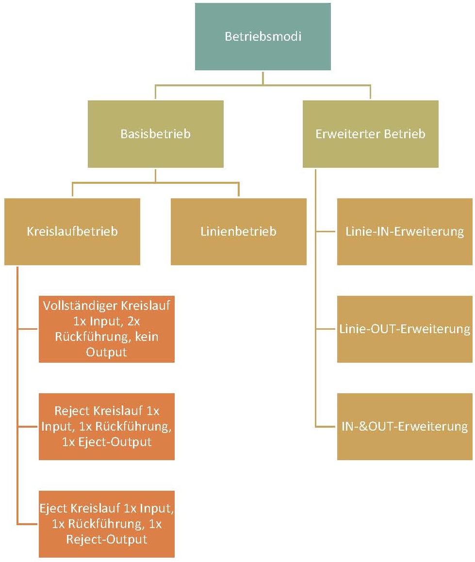 Je nachdem, ob das zu untersuchende Material die Anlage nur einmal oder (zumindest teilweise) mehrmals durchlaufen soll, wird hier nochmals zwischen Linienbetrieb (keine Materialrückführung) und Kreislaufbetrieb (Rückführung von mindestens einem Teilstrom) unterschieden.