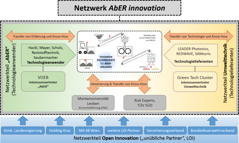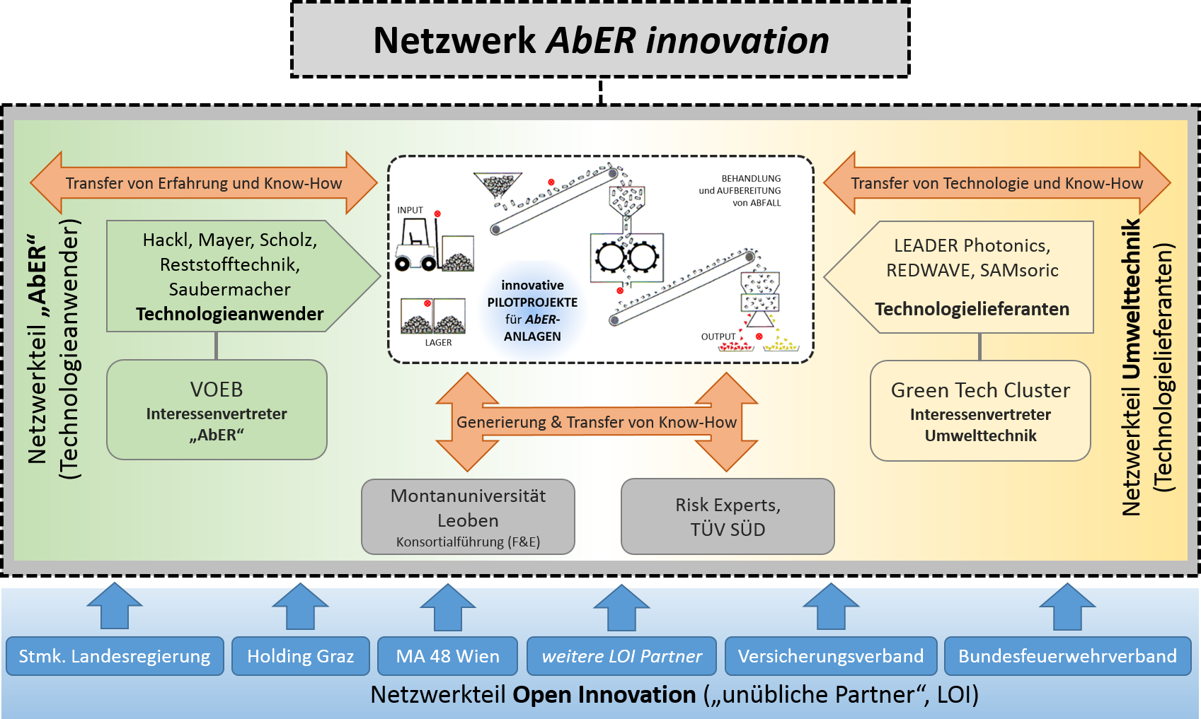 Beim Konsortium handelt es sich um ein neues interdisziplinäres strategisches Netzwerk, bestehend aus Unternehmen der Abfallwirtschafts-, Entsorgungs- und Recyclingbranche (AbER, Technologieanwender), Herstellern von Aufbereitungsaggregaten und -maschinen, Anbietern von Sensortechnik und Detektionsgeräten sowie einem Anlagenbauer (Technologielieferanten), Unternehmen im Bereich des Risiko Consulting, Prüfung, Überwachung- und Zertifizierung, zwei Intermediären (Interessenvertretung & Clusterorganisation), einer Universität und einer Reihe von LOI-Partnern.