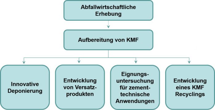- Entwicklung eines Konzepts zum Einsatz von KMF als Ersatzrohstoff und/oder Zumahlstoff in der Zementindustrie;