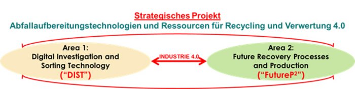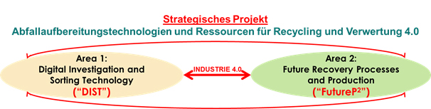 Das K-Projekt ReWaste4.0 besteht aus einem übergreifenden strategischen Projekt und zwei technischen Bereichen („Areas“) mit insgesamt sechs untergeordneten Einzelprojekten.