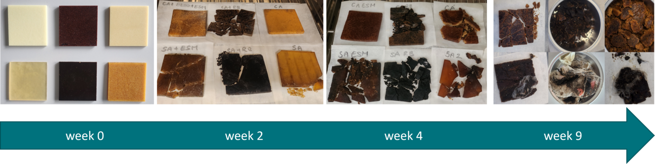 Die biologische Abbaubarkeit wurde unter realistischen industriellen Kompostierungsbedingungen bei der Poschacher Kompost GmbH über einen Zeitraum von 12 Wochen untersucht. Die Proben wurden regelmäßig entnommen, um zeitliche Veränderungen der Materialstruktur, der Masse und der Oberflächenmorphologie zu überwachen. Die Ergebnisse zeigten je nach Formulierung unterschiedliche Abbauverläufe, was auf das Vorhandensein mehrerer Abbaumechanismen hindeutet. Detaillierte Analysen mittels DSC, FTIR, gravimetrischer und mikroskopischer Verfahren lieferten mechanistische Einblicke in die chemischen und physikalischen Prozesse, die dem biologischen Abbau zugrunde liegen.