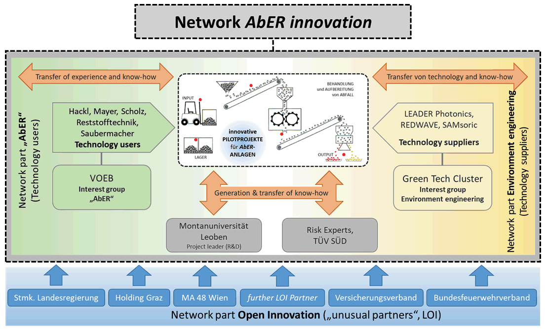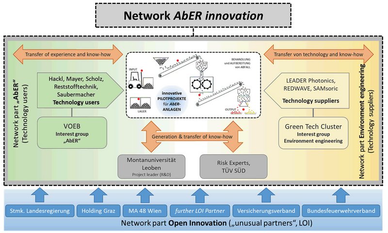 The consortium is a new interdisciplinary strategic network consisting of companies in the waste management, disposal, and recycling industry (AbER, technology users), manufacturers of processing units and machines, suppliers of sensor technology and detection devices, and a plant manufacturer (technology suppliers), companies in the field of risk consulting, testing, monitoring, and certification, two intermediaries (interest representation & cluster organization), a university, and a number of LOI partners.