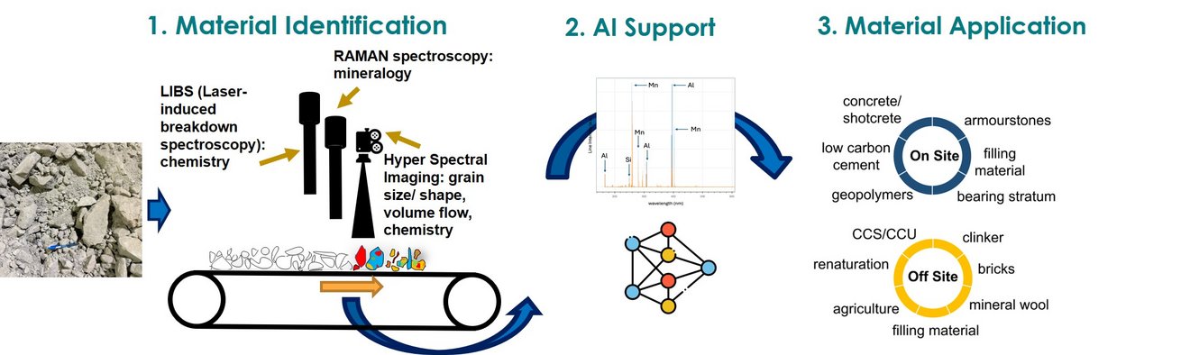 In the NNATT project model research and experimental work is conducted to identify tunnel- and excavated material with sensor based classification and deep learning. Representative tunnel- and excavation material from Austria is sampled, mineralogically, chemically and geotechnically characterized, sensor based measured in preliminary tests and finally applied in a conceptual pilot plant for material classification at the Zentrum am Berg in Eisenerz. Additionally, the project focuses on opportunities for application in alternative building materials, resulting in saving of primary raw materials and the associated reduction of CO2 emissions.