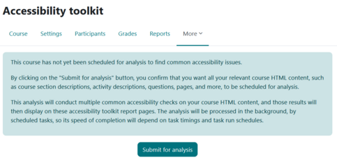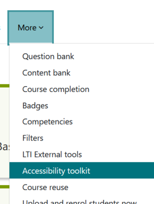 The Brickfield toolkit helps make Moodle courses more accessible. To do this, click on MORE/Accessibility Toolkit/submit for analysis.