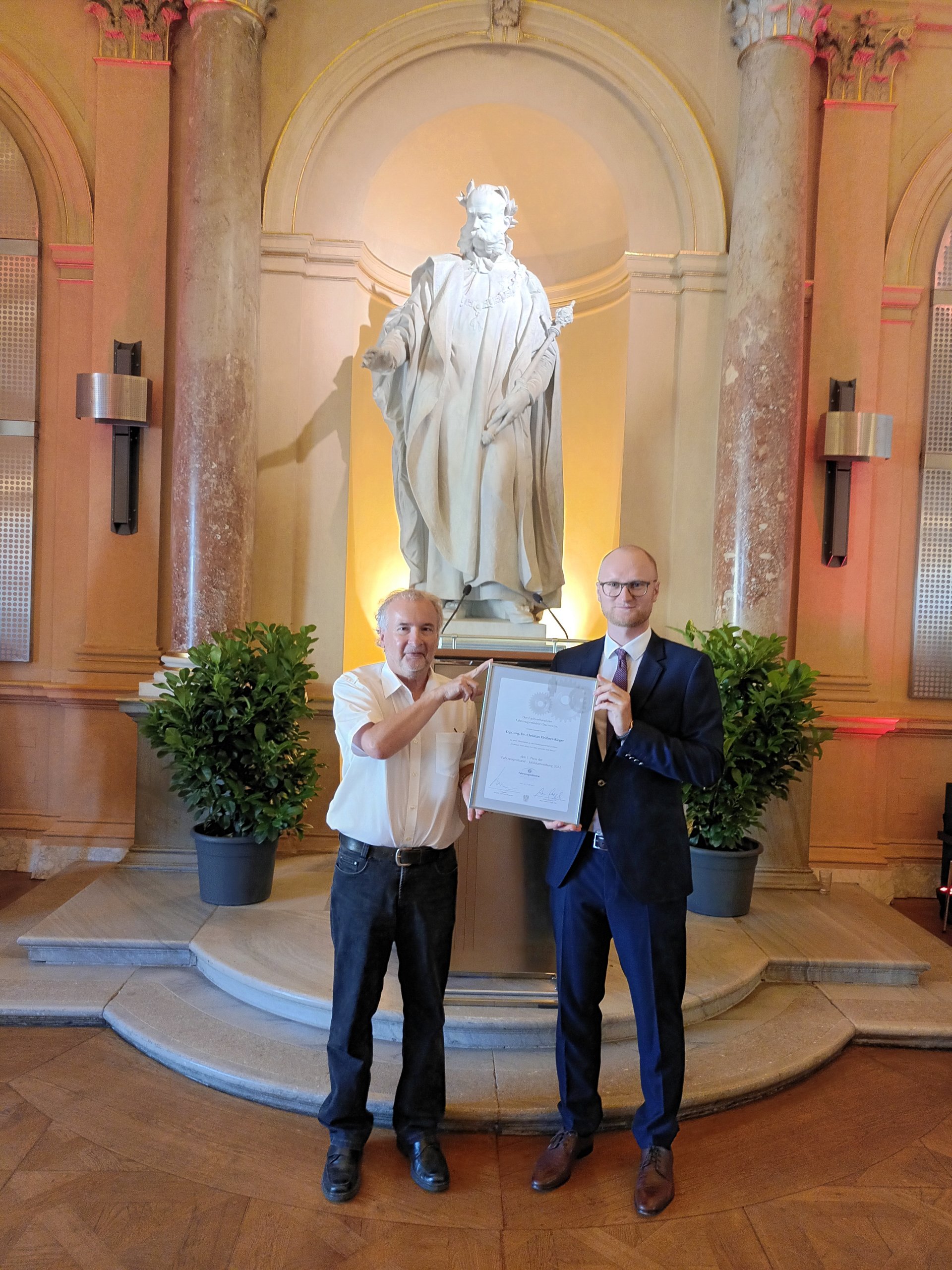 Christian Fleißner-Rieger, former doctoral student at the Chair of Physical Metallurgy, was awarded for his dissertation, entitled "Titanium Base Alloys for Laser Powder Bed Fusion" by the Fahrzeugverband Jubiläumsstiftung. Funded and supported by Pankl Racing Systems and voestalpine in Kapfenberg, his doctoral thesis dealt with the additive manufacturing of conventional as well as self-developed titanium alloys for racing applications. Mr. Fleißner-Rieger has found process parameters that lead to the formation of a special phase that is able to reduce internal stresses caused during additive manufacturing. At the same time, the components have excellent mechanical properties. The award ceremony took place on July 11, 2023 in the auditorium of Graz University of Technology.