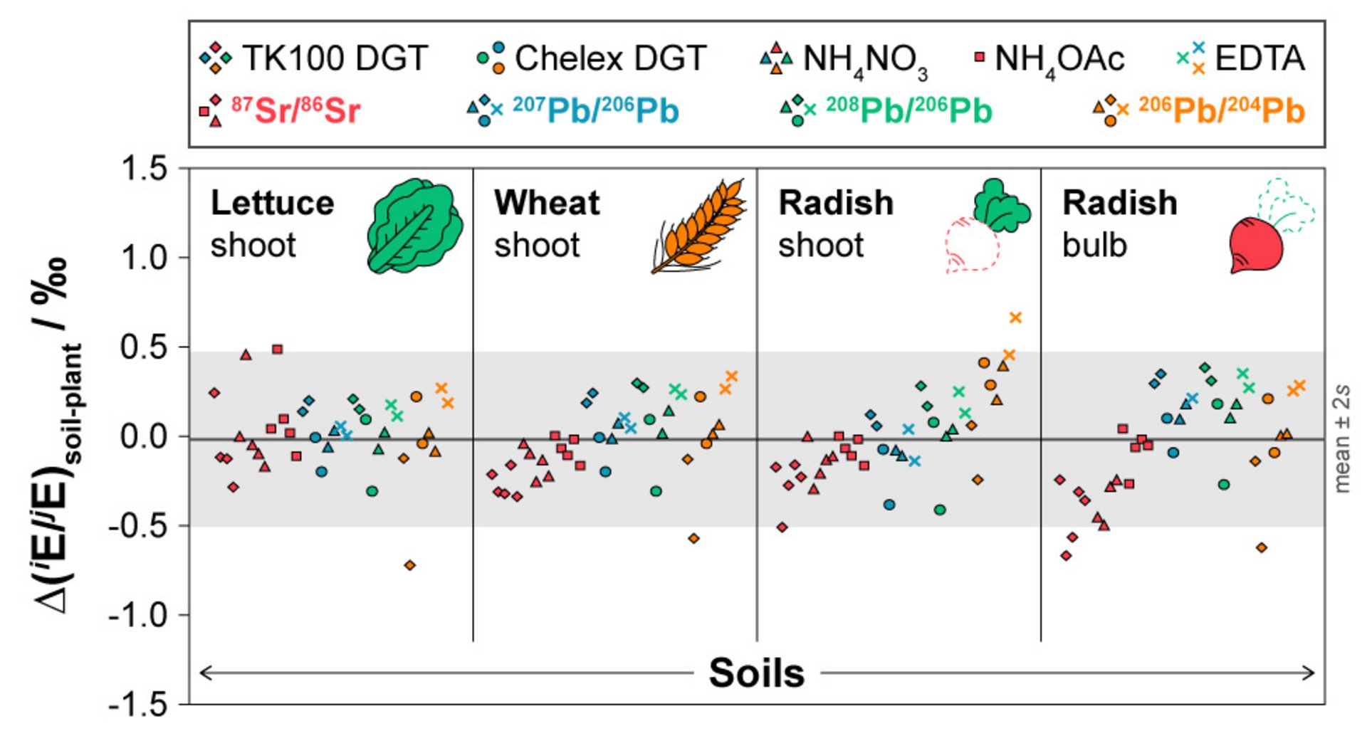 This study evaluated the potential of the diffusive gradients in thin films (DGT) technique to assess radiogenic strontium (Sr) and lead (Pb) isotope signatures in bioavailable soil fractions as a proxy for plant uptake. Concentrations (cDGT) and isotope ratios of Sr (87Sr/86Sr) and Pb (207Pb/206Pb, 208Pb/206Pb, 206Pb/204Pb) assessed by DGT (TK100, Chelex), along with extractable (NH4NO3, NH4OAc, EDTA) and total Sr and Pb mass fractions and isotope ratios, were compared to those in Lactuca sativa L. (lettuce), Triticum aestivum L. (wheat), and Raphanus sativus L. (radish) grown on five geochemically distinct soils. Relative to conventional soil extraction, DGT significantly reduced matrix loads, facilitating isotope ratio measurements by multi-collector inductively coupled plasma mass spectrometry. DGT-labile Sr and Pb concentrations and isotope ratios reflected soil-specific geochemical signatures, allowing for clear differentiation among soils. Importantly, DGT-labile isotope ratios closely matched those in plant tissues across soils and species within analytical uncertainty, demonstrating that DGT captures the isotopically relevant bioavailable Sr and Pb pool without inducing significant mass-dependent isotopic fractionation. These findings establish DGT as a practical tool for bioavailable multi-isotope tracing with strong potential for applications in environmental forensics, food authentication, and archaeological provenance research.