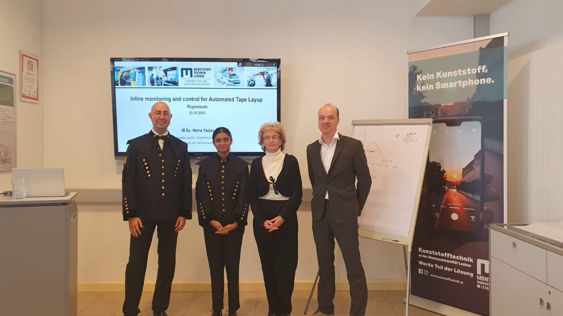 With her viva on the topic of "Inline Monitoring and Control for Automated Tape Laying", Neha Yadav successfully completed her doctoral studies at the University of Leoben today. This is the second time Yadav has had reason to celebrate in October; she was also recently awarded the ÖWGP Doctoral Prize (we reported). Neha Yadav's dissertation at the Institute of Processing of Composites focused on different approaches for automated detection of material-inherent as well as process-induced defects in laminates made of continuously fiber-reinforced polymeric composites produced by thermoplastic lay-up technology.