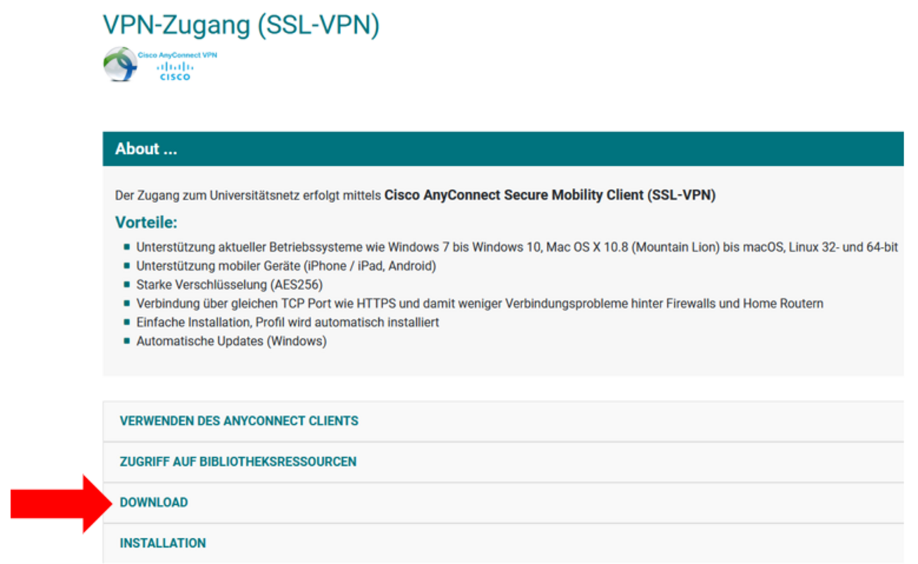 Öffnen Sie den Link https://ict.unileoben.ac.at/infrastruktur/vpn-zugang-ssl-vpn im Browser und laden Sie die gewünschte Datei für Ihr Betriebssystemherunter.