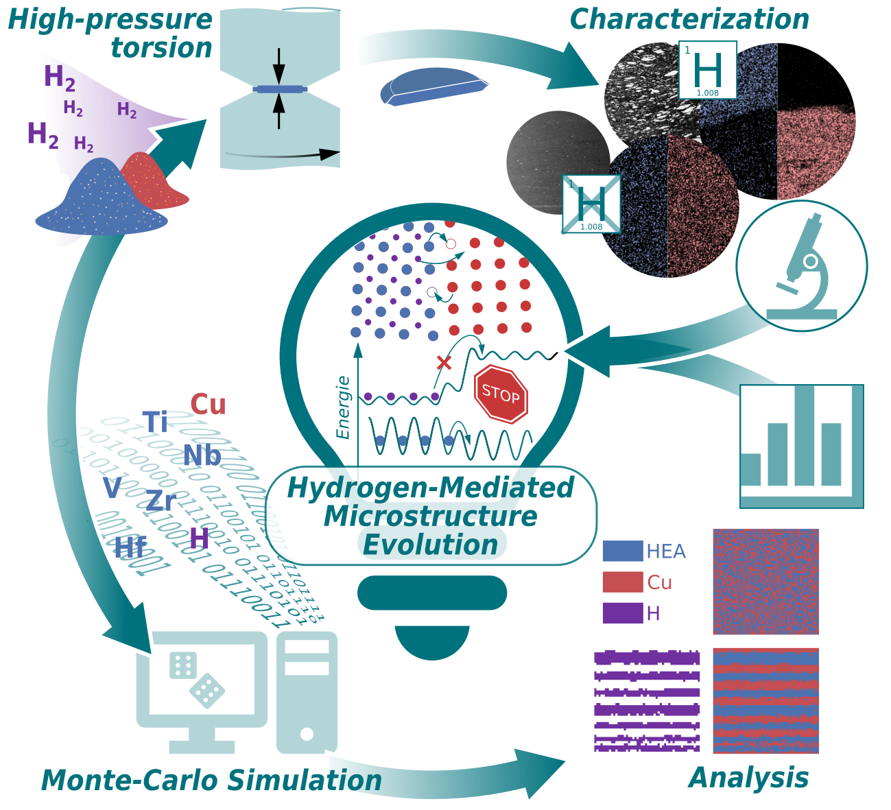 In der Arbeit führt die Ultrahochverformung eines Komposits aus der äquiatomaren Hochentropie-Legierung (HEA) TiVZrNbHf und Kupfer zu vollständiger mechanisch hervorgerufener Legierung (d.h. Vermischung) und anschließender Amorphisierung. Wenn jedoch Wasserstoff durch Ersetzen der HEA durch die entsprechende Metallhydrid-Verbindung eingeführt wird, wird dieser Prozess unterdrückt und die Zweiphasenstruktur wird stabilisiert. Computer-Simulationen mit dem Monte-Carlo-Verfahren zeigen die zugrunde liegende Ursache: Die deutlich unterschiedlichen Wasserstoffaffinitäten der beiden Phasen in Verbindung mit der verringerten Verformbarkeit des Hydrids wirken als Barriere für das mechanische Legieren.