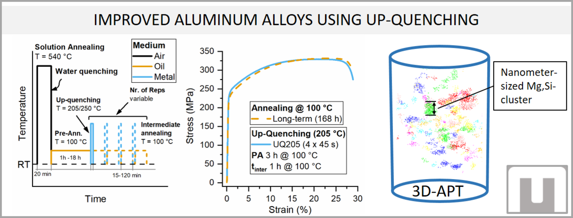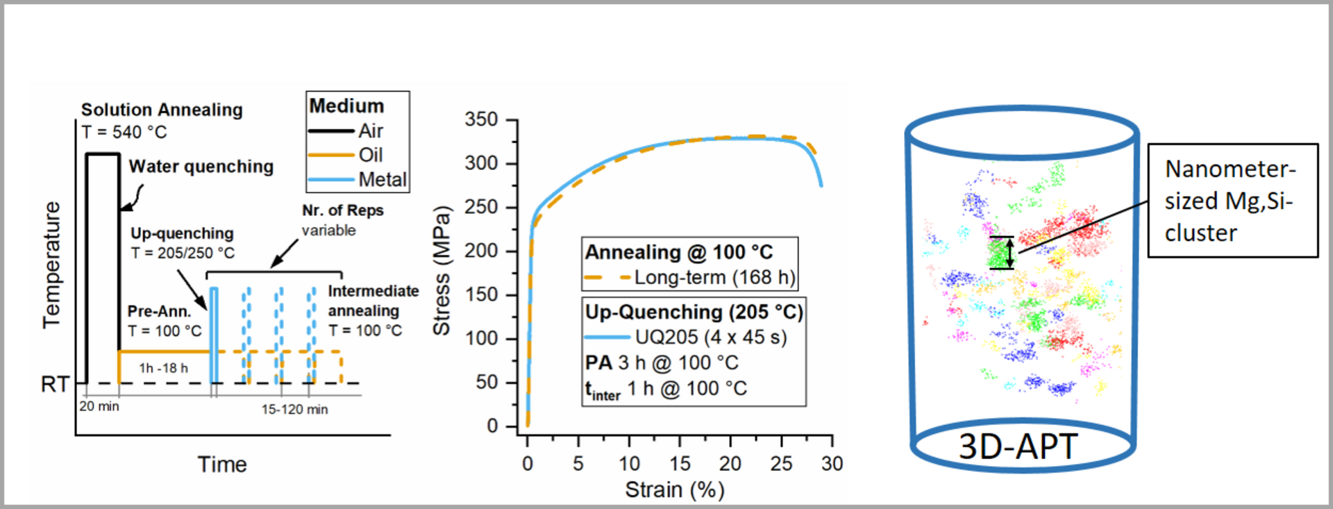 Unter Zuhilfenahme von Simulationen wurde eine gänzlich neue Wärmebehandlung gefunden, welche anstatt des üblichen raschen Abschreckens auf rasches Aufheizen – Up-Quenching – setzt. In diesem Zusammenhang erklärt Dr. Florian Schmid, PostDoc im Christian Doppler Labor für fortgeschrittene Aluminium-Legierungen: „Normalerweise werden Aluminiumlegierungen im Rahmen einer klassischen Wärmebehandlung ein einziges Mal erwärmt und anschließend möglichst schnell abgeschreckt. Durch wiederholtes kurzzeitiges Erwärmen auf eine mittlere Temperatur können Eigenschaften innerhalb weniger Stunden erzeugt werden, welche sonst nur in einer unökonomisch langen Dauer von mehr als einer Woche realisierbar sind.“ Das neue Verfahren beschleunigt die Bildung von nanometergroßen Atomclustern, welche einen einzigartigen Weg zu hoher Festigkeit bei gleichzeitiger Beibehaltung einer guten Verformbarkeit ermöglichen. In einem aufsehenerregenden Artikel im neuen Nature Research Journal „Communications Materials“ demonstrieren die Forscher das Prinzip und die Möglichkeiten dieses neuartigen Verfahrensweges. Basierend darauf soll der Einsatz von Aluminium im Transportsektor noch attraktiver werden.