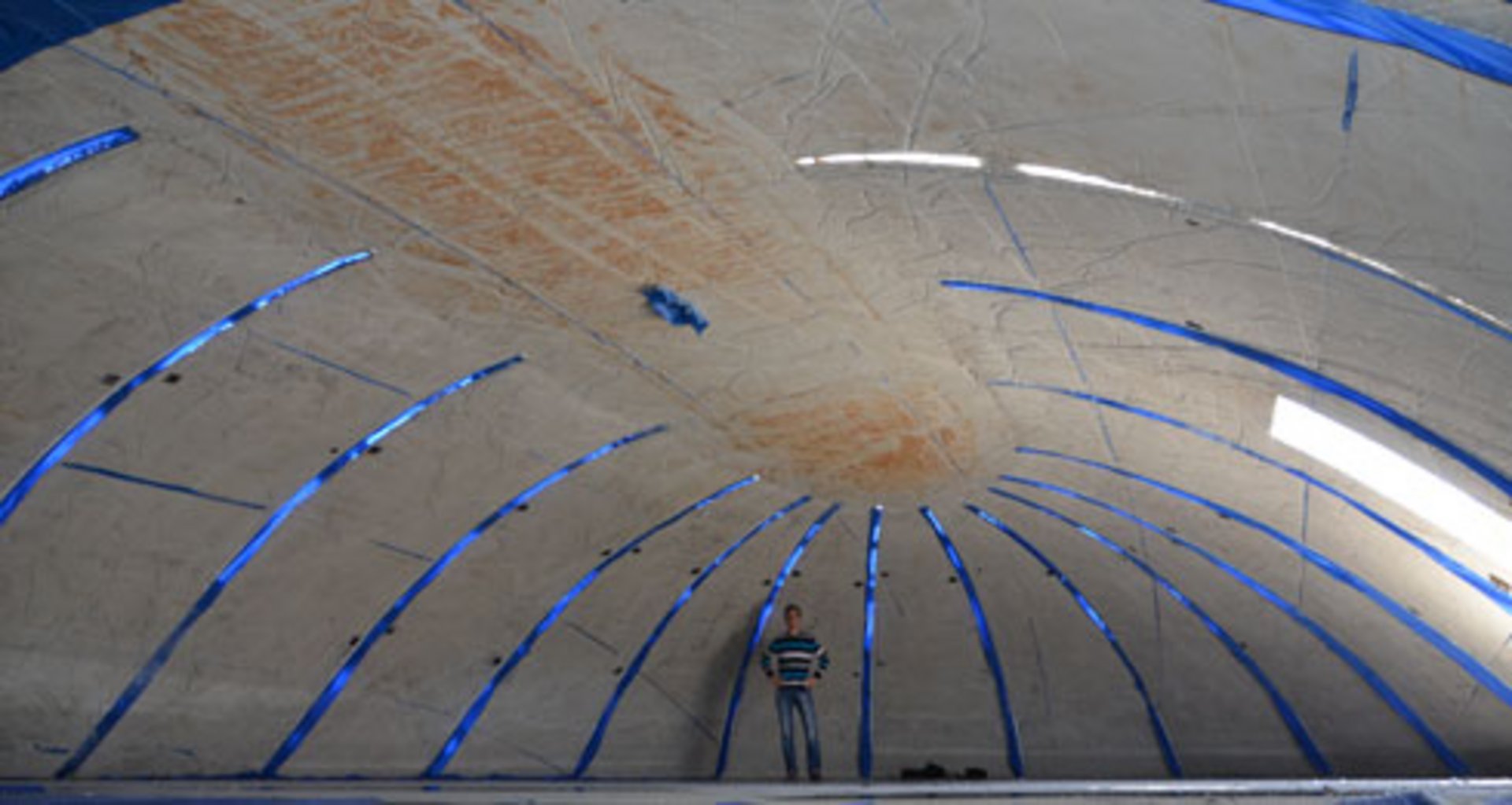 Während sich der Beton verbiegt, entstehen unzählige kleine Risse – doch für die Stabilität der Schale ist das kein Problem. „Man kennt das ja von alten Steinbögen“, erklärt Johann Kollegger. „Wenn die Form stimmt hält jeder Stein den anderen fest und die Konstruktion hält.“ Am Ende wird das Bauwerk noch verputzt, danach hält es genauso großen Belastungen stand wie eine auf herkömmliche Weise errichtete Kuppel.
