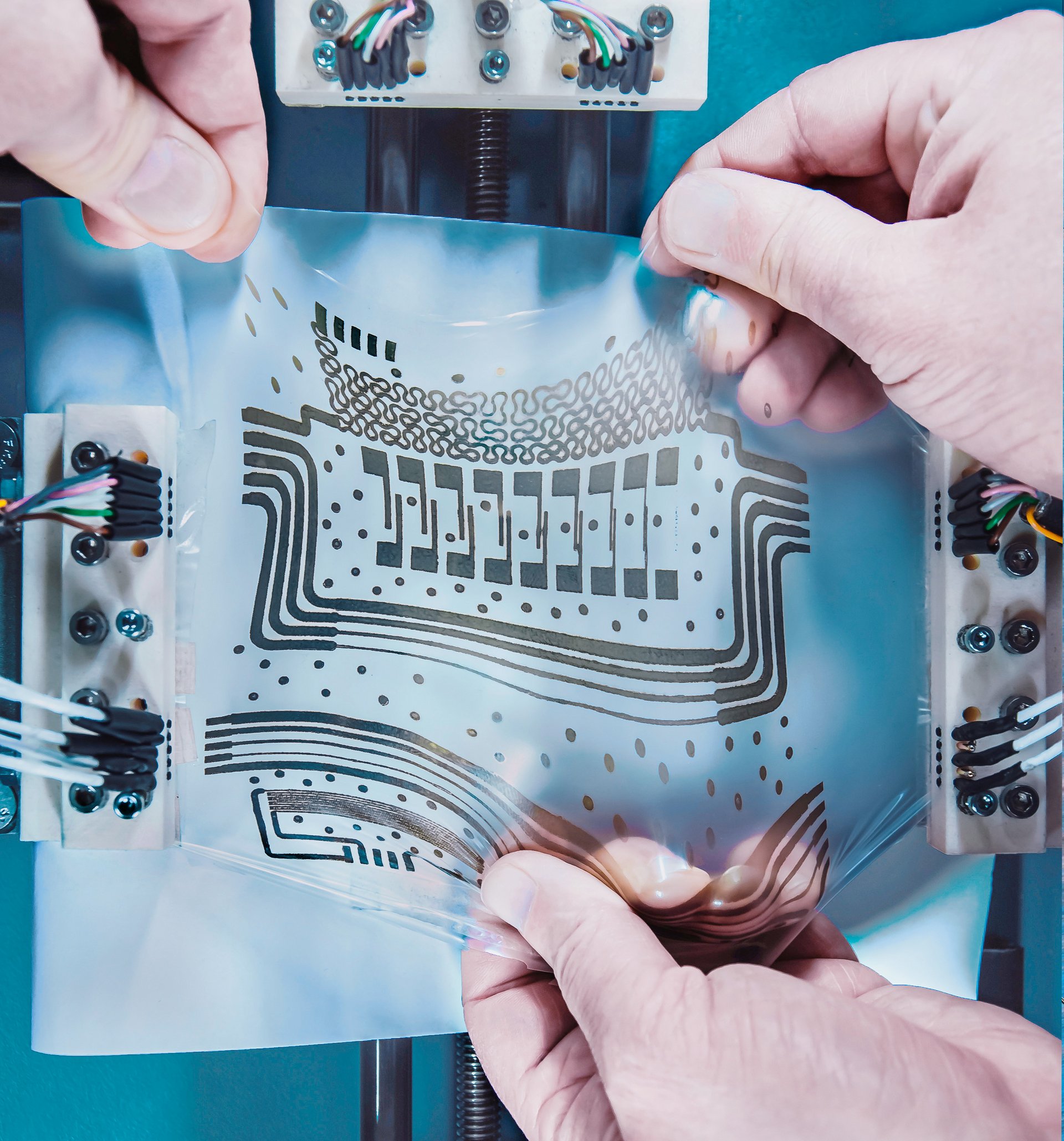 Die Entwicklung von dehnbaren, leitfähigen Materialien eröffnet die Möglichkeit der einfachen Integration elektronischer, multifunktioneller Sensorsysteme beispielsweise in Kleidung oder auf dreidimensionalen Oberflächen von Maschinen, menschlicher Haut oder Kunststoff. In dem Artikel „Self-Reducing Silver Ink on Polyurethane Elastomer for the Manufacturing of Thin and Highly Stretchable Electrical Circuits“ präsentiert das Team seine Ergebnisse zur Entwicklung einer Tinte basierend auf komplexierten Silberverbindungen. „Mit dieser Tinte konnten leitfähige und zugleich dehnbare Leiterbahnen auf Folien per Siebdruck hergestellt werden. Die Leiterbahnen sind bis zu 200 Prozent dehnbar – das ist beispiellos für solche Materialien“, erläutert Univ.-Prof. Dr. Thomas Grießer. Im Vergleich zu kommerziellen dehnbaren Siebdrucktinten erwies sich das entwickelte System auch bei zyklischen Belastungen als überlegen. Daraus ergibt sich eine Vielzahl von Anwendungsgebieten: „Es wäre zum Beispiel ein ideales Material zum Einsatz in künstlicher Haut von Prothesen oder Robotern“, skizziert Grießer. Auch die Verwendung in „intelligenter“ Kleidung zur Überwachung der Körperfunktionen wäre denkbar.