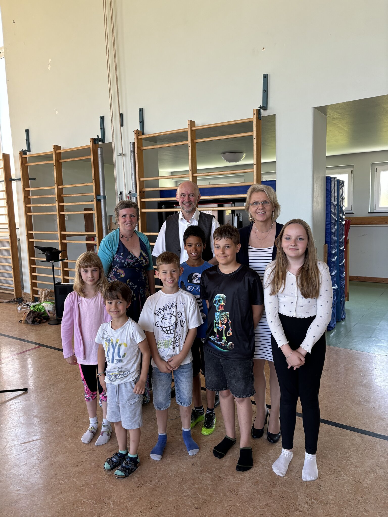 Bei der Projektpräsentation in der Volksschule Drosendorf: Theresa Bender, Muhammed Nestorov, Daniel Heger, Reinhard Diogo-Lehner, Levente Szabo und Elisabeth Schneider (vorne, von l.), Direktorin Beatrix Hengstberger, Robert Kamper von der Pädagogischen Hochschule NÖ und Schulqualitätsmanagerin Andrea Strohmayer (hinten). (Foto: VS Drosendorf)