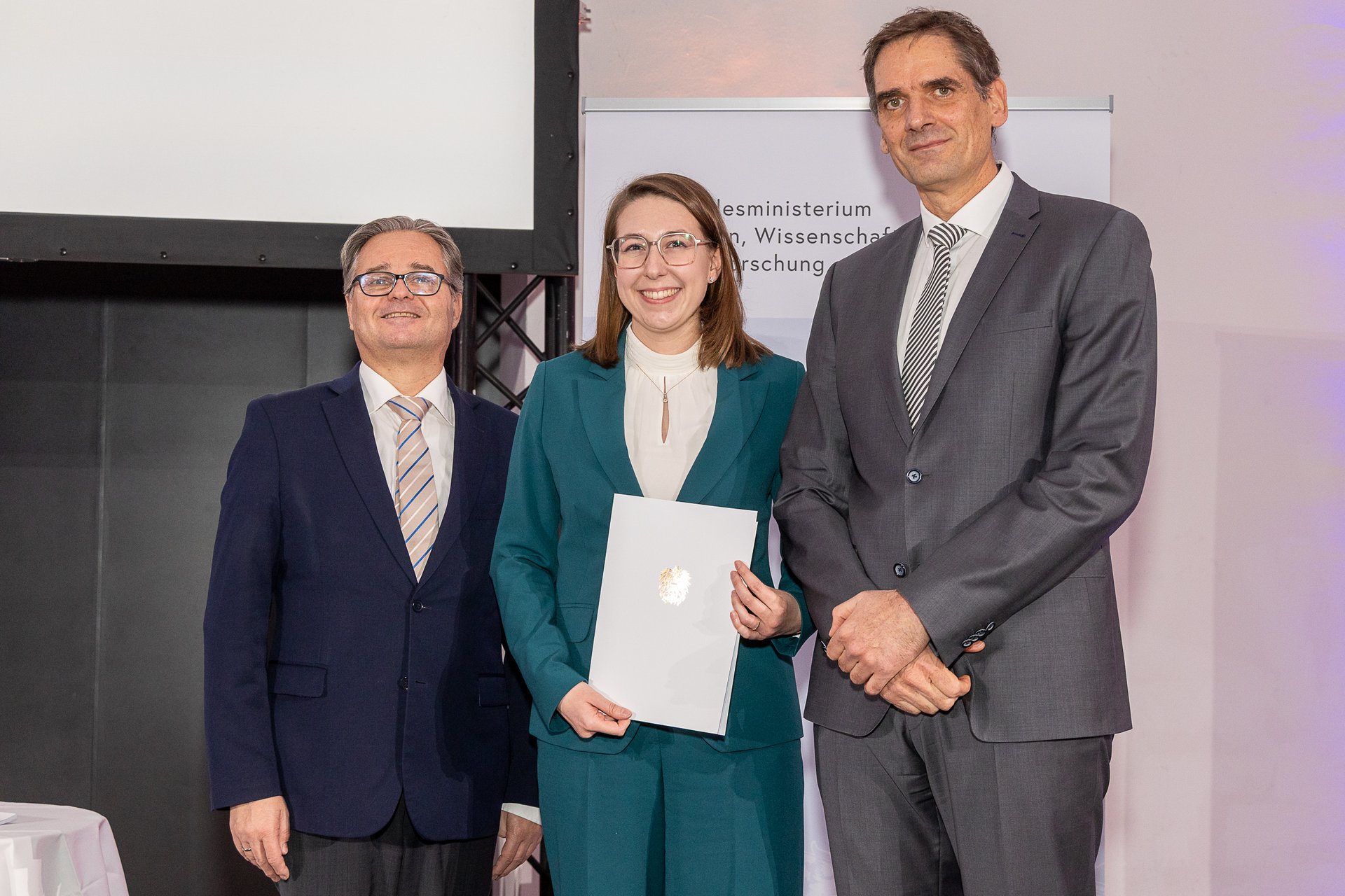 Der Preis wurde in Vertretung der Bundesministerin von Mag. Heribert Wulz aus der Hochschulsektion des BMFWF überreicht. Zum krönenden Abschluss der Zeremonie durfte Dipl.-Ing. Moser im Namen der Preisträger*innen außerdem die Dankesrede halten. Studiendekan Univ.-Prof. Thomas Antretter war zudem als Vertreter der Montanuniversität bei der Zeremonie zugegen.