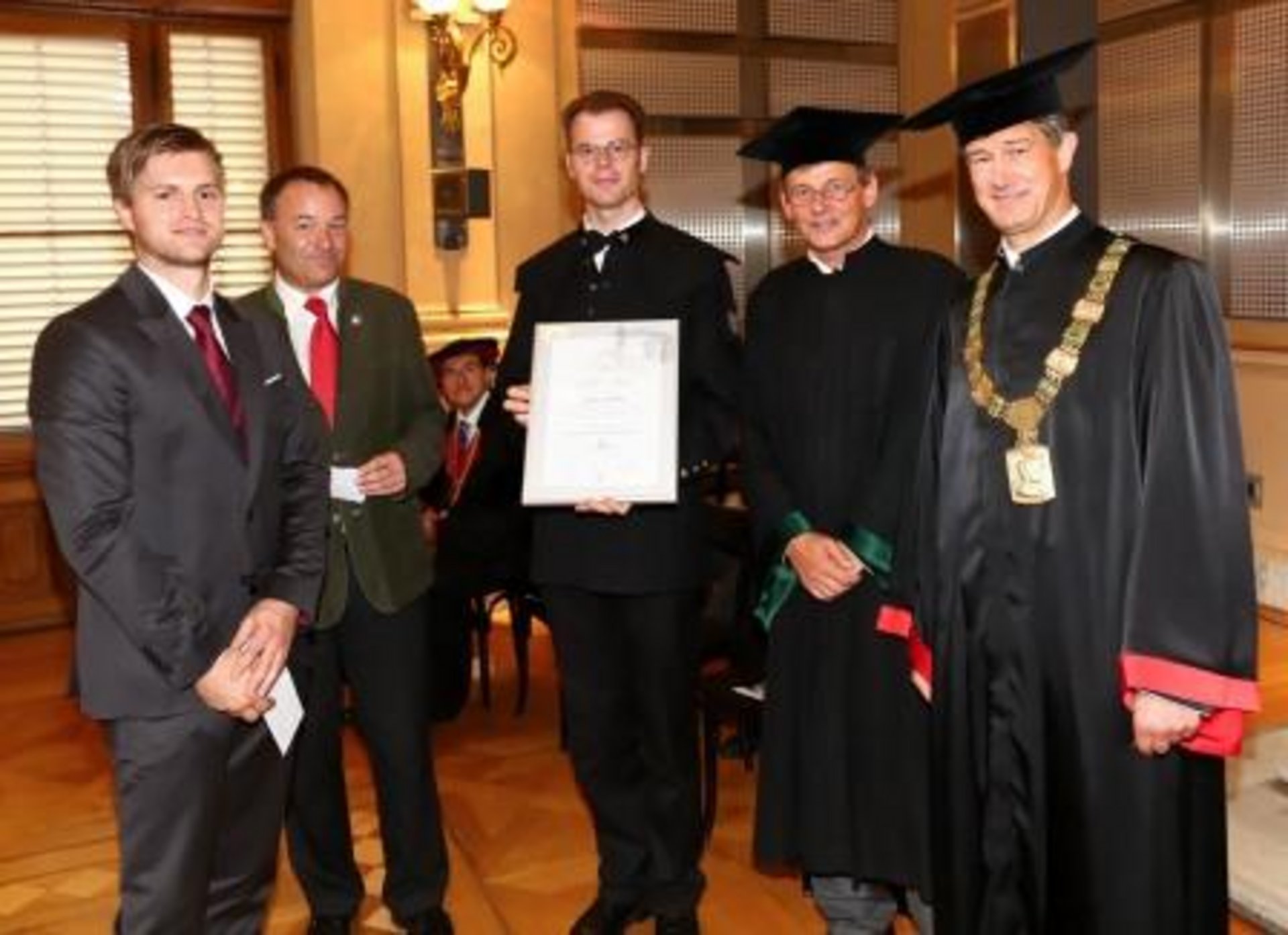 v.l.n.r.: Dipl.-Ing. Jürgen Schiffer (Preisträger, Montanuniversität Leoben), Mag. Walter Linszbauer (Geschäftsführer des Fachverbandes der Fahrzeugindustrie Österreichs), Univ.-Prof. Dipl.-Ing. Dr.mont. Florian Grün (Lehrstuhl für Allgemeinen Maschinenbau, Montanuniversität Leoben), Univ.-Prof. Dipl.-Ing. Dr.techn. Helmut Eichlseder (Institut für Verbrennungskraftmaschinen und Thermodynamik, TU Graz), Univ.-Prof. Dipl.-Ing. Dr.techn. Dr.h.c. Harald Kainz (Rektor TU Graz)
