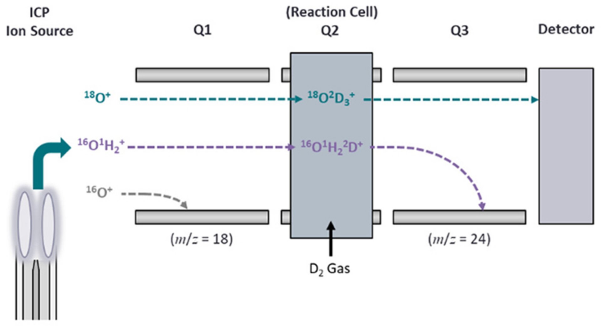 A fully validated measurement approach for the determination of oxygen isotope ratios in water using inductively coupled plasma–tandem mass spectrometry (ICP-MS/MS) is described for the first time. Deuterium was used as a reaction gas to mass-shift the oxygen isotopes to the OD3+ product ion, allowing for the removal of polyatomic ions (16O1H+ and 16O1H2+) generated in the plasma that interfere on the less abundant oxygen stable isotopes (17O and 18O). The developed methodology was validated for δVSMOW-SLAP(18O/16O) determinations using four internationally recognized IAEA reference materials, as well as 11 in-house laboratory isotope reference materials that were characterized by isotope ratio mass spectrometry and cavity ring-down spectroscopy. δVSMOW-SLAP(18O/16O) values determined by ICP-MS/MS and the reference methods overlapped within the uncertainties and showed no significant difference for water materials with a low matrix load. Elevated levels of sodium, chloride, and silicon in the matrix lead to isotope ratio shifts of up to 12‰ in both the positive and negative directions. Additionally, comparisons with indicative values from the reference materials demonstrated that δVSMOW-SLAP(17O/16O) determinations are also possible using the ICP-MS/MS approach. While the uncertainty of the developed approach (median uncertainty uc(δVSMOW-SLAP(18O/16O)) = 0.70‰) is not currently able to match that of existing methodologies, it is envisioned that oxygen isotope ratio determinations can be performed alongside multielemental analysis by a wider community for applications where lower uncertainties are not required.