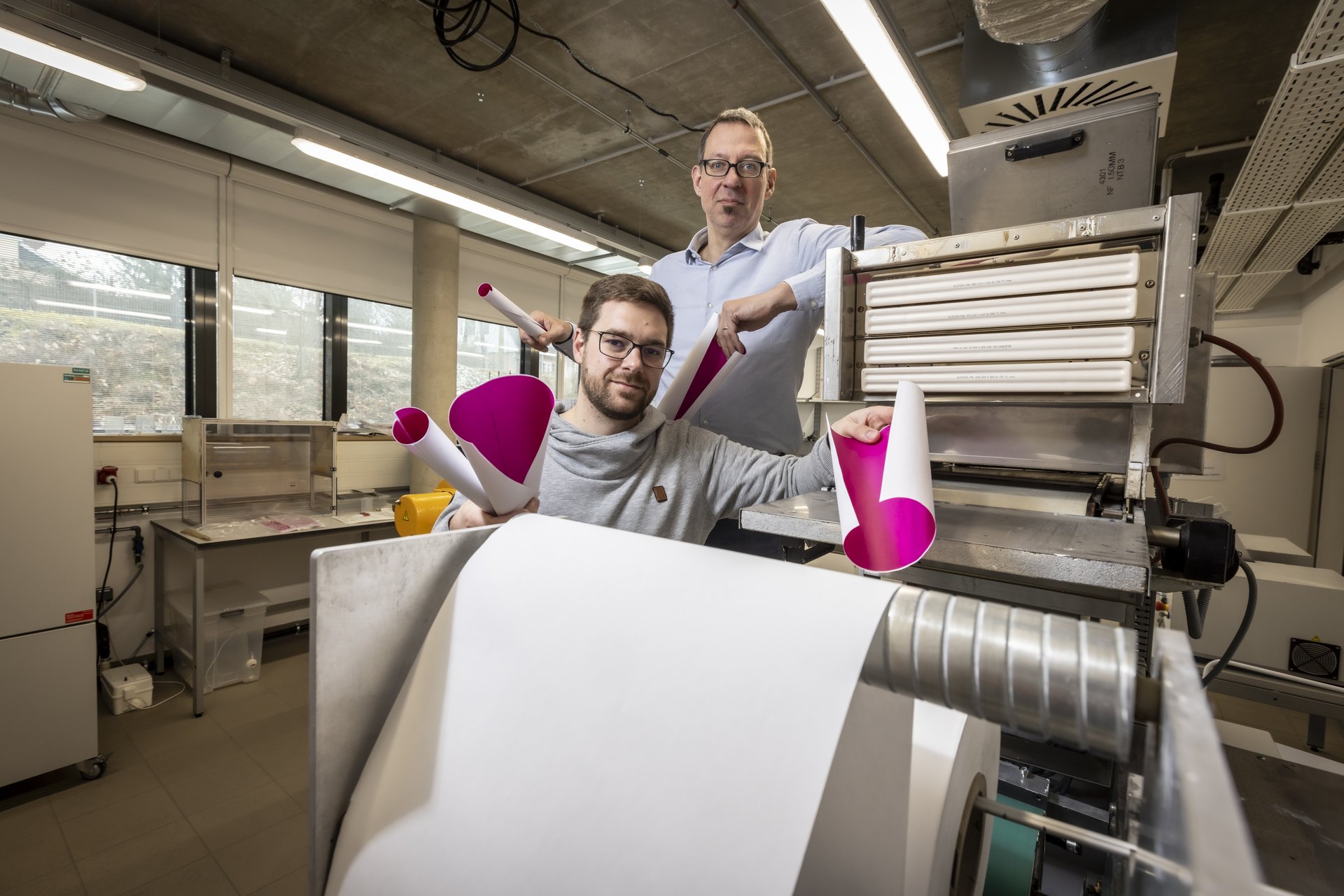 Obwohl die Menschheit Papier seit mindestens 2000 Jahren nutzt, gibt es uns noch immer das eine oder andere Rätsel auf. So war bislang unbekannt, warum einseitig bedrucktes Papier nach einigen Stunden bis Tagen beginnt, sich aufzurollen, nachdem es im Inkjet-Verfahren bedruckt wurde und nach dem Drucken und Trocknen eigentlich glatt war. Ulrich Hirn und Alexander Maaß vom Institut für Biobasierte Produkte und Papiertechnik der TU Graz haben nun den Grund gefunden: Verantwortlich sind in der Tinte enthaltene Lösungsmittel, die im Laufe der Zeit in Richtung der unbedruckten Seite durch das Papier wandern. Dadurch quellen die Zellulosefasern auf der unbedruckten Seite und das Papier rollt sich auf.