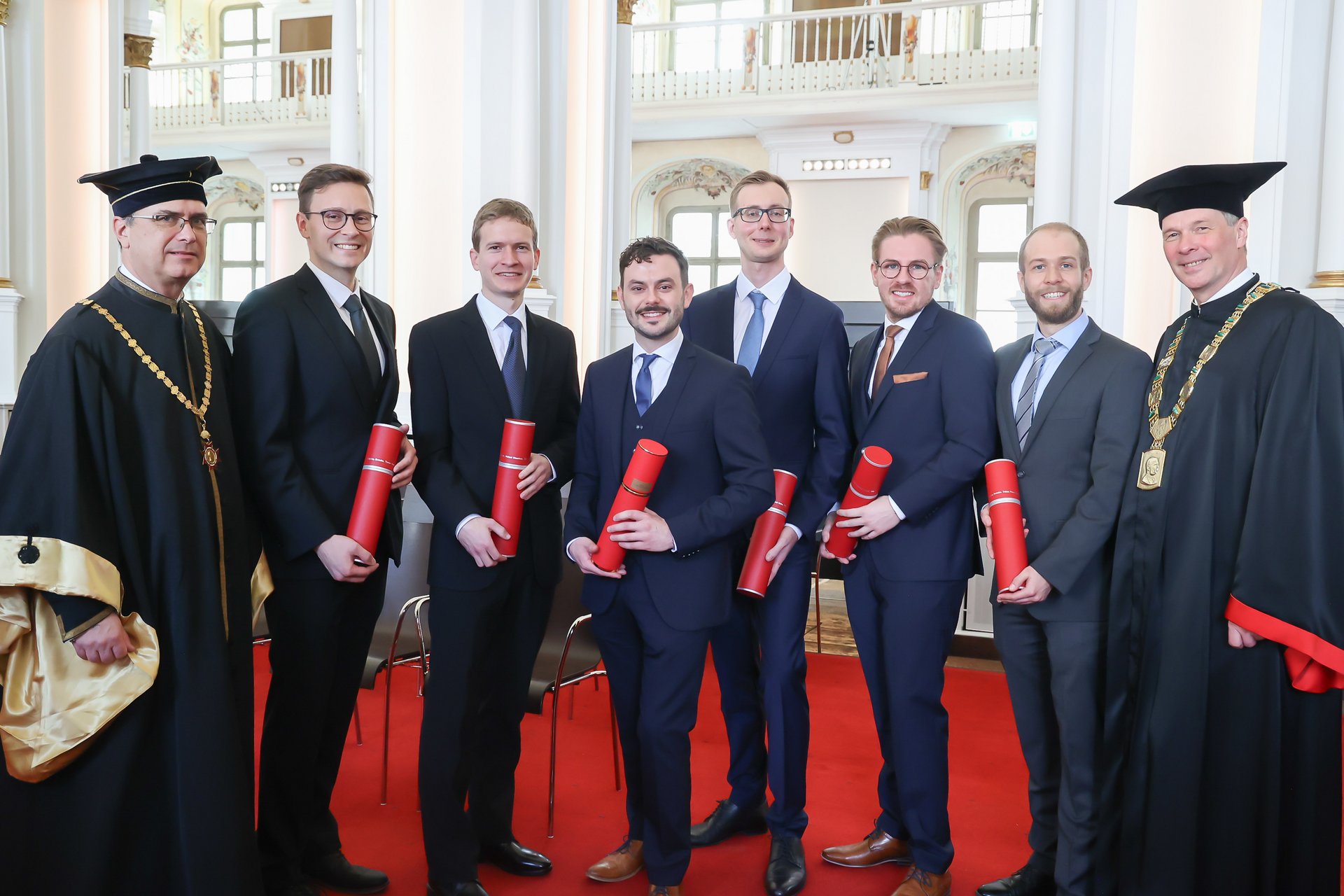 Die Promotion „sub auspiciis Preasidentis rei publicae“ gelingt nur den allerwenigsten Absolvent*innen österreichischer Hochschulen. Jetzt durften in Graz gleich sechs Wissenschafter diese Glanzleistung feiern: Der klassische Philologe Lukas Spielhofer (Universität Graz), die Informatiker Daniel Kales und Tobias Scheipel, die Mathematiker Gabriel Lipnik und Michael Missethan sowie der Physiker Tomas Kamencek (alle TU Graz) haben sich diese Auszeichnung aufgrund ihrer außergewöhnlichen schulischen und akademischen Leistungen verdient.