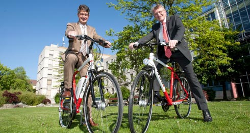 „Technik bewegt" - auf der ganzen Linie: Technikerinnen und Techniker gestalten nicht nur wichtige Entwicklungen entscheidend mit und „bewegen" damit die Gesellschaft; sie sind auch selbst ständig in Bewegung: als passionierte Radfahrer am Arbeitsweg oder auch tagsüber. Ab sofort flitzen die Grazer Techniker unter diesem Motto sogar im TU-Design durch die steirische Landeshauptstadt. „Optisch und preislich sehr attraktive TU-Fahrräder für unsere Mitarbeiterinnen und Mitarbeiter anzubieten ist Teil unseres erfolgreichen Mobilitätskonzepts", freut sich TU-Rektor Hans Sünkel über das neue Angebot im Jahr des 200-jährigen Bestehens seiner Universität.