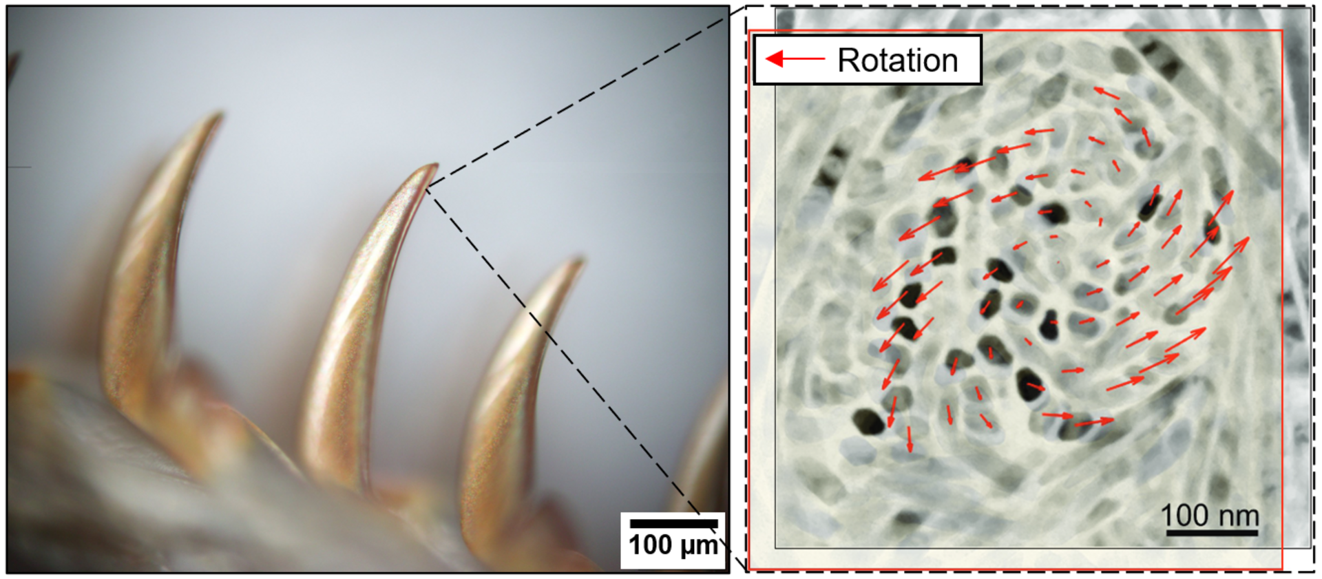Zähne der Napschneckenradula und elektronenmikroskopische Aufnahme des Rotationsmusters der Nanorod-Bündel unter Belastung. Copyright: Montanuniversität Leoben / Michael Wurmshuber