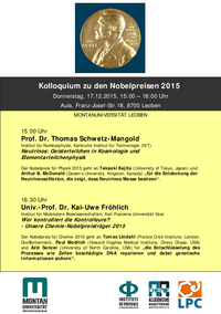 Kolloquium zu den Nobelpreisen 2015 Donnerstag, 17.12.2015, 15:00 – 18:00 Uhr Aula, Franz-Josef-Str.18, 8700 Leoben MONTANUNIVERSITÄT LEOBEN 15:00 Uhr Prof. Dr. Thomas Schwetz-Mangold Institut für