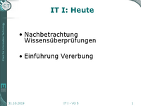 IT I: Heute • Nachbetrachtung Wissensüberprüfungen • Einführung Vererbung 31.10.2019 IT I - VO 5 1 Nachbetrachtung Wissensüberprüfung Gegeben: Klasse Anlage mit Methode boolean bearbeite(Produkt