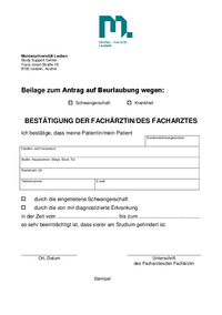 Montanuniversität Leoben Study Support Center Franz-Josef-Straße 18 8700 Leoben, Austria Beilage zum Antrag auf Beurlaubung wegen: Schwangerschaft Krankheit BESTÄTIGUNG DER FACHÄRZTIN/DES