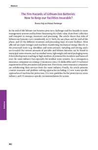 Abstract The Fire Hazards of Lithium-Ion Batteries: How to Keep our Facilities Insurable? Thomas Nigl and Roland Pomberger Batterien In the end-of-life lithium-ion batteries pose new challenges