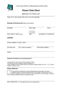 …University Library of Montanuniversität Leoben Master Data Sheet Application for a library card Please, fill in in block capitals. Mark with a cross where applicable. |__________________________| ID Number of the…
