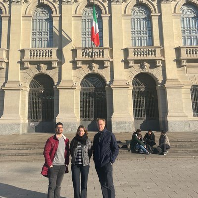 Maria, Professor Valter Carvelli, ihr Betreuer am Politecnico di Milano und ihr Kollege vor dem Hauptgebäude der Mailänder Universität © Privat