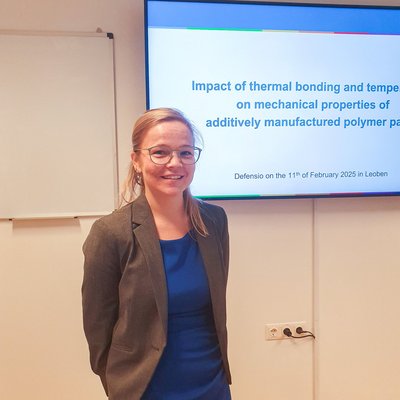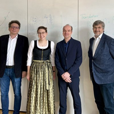 Die glückliche Absolventin mit den Prüfern v.l.n.r.: Prof. Peter Auer (Vorsitz), Karoline Moser (Absolventin), assoz.Prof. Ewald Fauster (Erstprüfer), Prof. Jörg Thuswaldner (Zweitprüfer ) © Department Kunststofftechnik